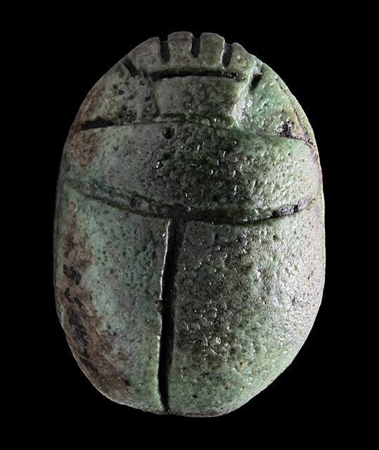 Scarabeo in faience turchese con sul ventre incisione che rappresenta una triade divina su un segno neb. Il dio centrale ha la corona di Ammone e quello di destra il disco solare sul capo.Il dorso presenta clipeo, protorace ed elitre separati da incisione a T. Foro passante longitudinale.