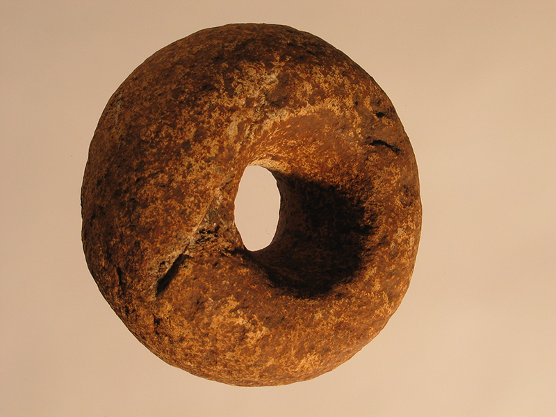Grosso anello di pietra calcarea con ampio foro centrale, di stile Usulután. Si tratta di una testa per una mazza litica. All’interno del foro era inserito un robusto manico di legno. Presso alcune culture precolombiane le mazze di pietra facevano parte delle armi del guerriero. Potevano essere semplici ad anello o a stella.