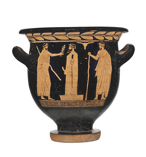 Cratere a campana lucano a figure rosse lato A: erma di Hermes tra due figure maschili; Lato B: Tre giovani ammantati