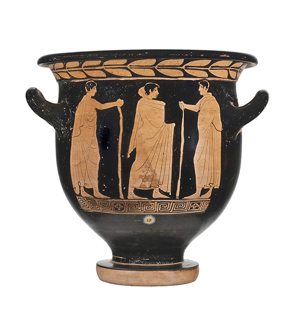 Cratere a campana a figure rosse in argilla marrone rossastro chiaro (Munsell 5 YR 6/4) con vernice nera di buona qualità, lucente, con minime scalfitture in alcuni punti. Leggerissimo strato di patina fluorescente, forse di origine vegetale o forse dovuto a problemi di cottura. Il vaso presenta una larga imboccatura con orlo estroflesso distinto e labbro arrotondato; il corpo campaniforme poggia su un corto stelo con piede a disco e profilo troncoconico rovesciato e arrotondato. Le anse a bastoncello sono impostate orizzontalmente appena oltre la metà del corpo, incurvate verso l'alto e risparmiate all'interno. Lato A: al centro della scena è raffigurata un'erma di Hermes itifallico e barbuto con kerykeion (caduceo); essa è rappresentata di profilo verso sinistra, rivolta verso una figura maschile ammantata, che, poggiando il peso sulla gamba destra, offre all'erma un tirso, mentre con la mano sinistra, nascosta dietro al chitone, regge un bastone. Alle spalle dell'erma è raffigurata una seconda figura maschile ammantata e stante, che si regge ad un bastone con la mano destra; il corpo è raffigurato di fronte, mentre la testa, su cui è posata una corona d'alloro, è ritratta di profilo verso sinistra. Infine, in alto, tra l'erma e la figura maschile di destra, è stato dipinto un bucranio. Lato B: sono raffigurati tre giovani ammantati a colloquio. Tutte e tre le figure sono ritratte stanti e di profilo. I due giovani ai lati si appoggiano con il braccio destro, lasciato scoperto dall'hymation, ad un bastone; il giovane al centro, invece, appare totalmente avvolto dal mantello. Il giovane a sinistra e quello centrale sono rivolti verso il giovane più a destra. La decorazione accessoria nella parte interna è costituita da due fasce risparmiate, di cui la prima è più sottile e cade all'altezza dell'orlo, mentre l'altra è più spessa e si colloca proprio nel punto in cui sulla parete esterna cominciano le scene figurate sotto le tese del vaso. La decorazione accessoria esterna, invece, è costituita, sotto il labbro, da un tralcio di foglie d'olivo che corre per tutta la circonferenza ed è incorniciato da due fasce risparmiate di cui la superiore si allunga fino a coprire tutto il bordo inferiore del labbro e quella inferiore è incastonata all'interno di una sottile modanatura. La parte sottostante le scene figurate, invece, è arricchita da un meandro interrotto da rettangoli con angoli evidenziati/anneriti e croce inscritta. Vi è un sottile filetto orizzontale inciso tra stelo e piede, mentre lo spessore del piede, la zona tra gli attacchi delle anse e la parte interna delle anse sono risparmiati.