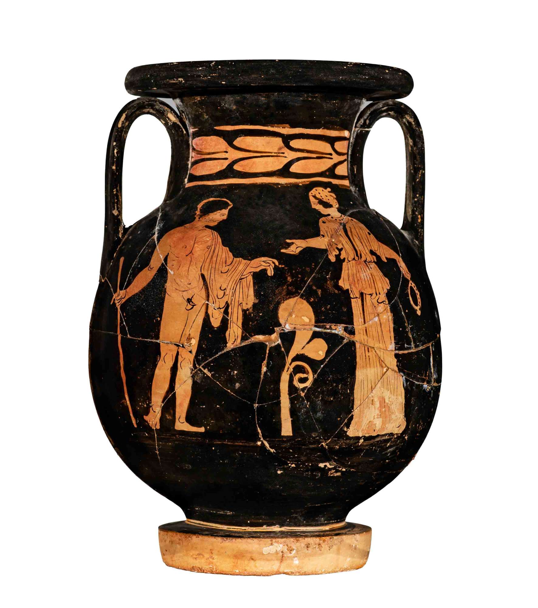 Pelike apula a figure rosse. Lato A: giovane nudo con bastone, figura femminile con serto. Lato B: due figure maschili ammantate.