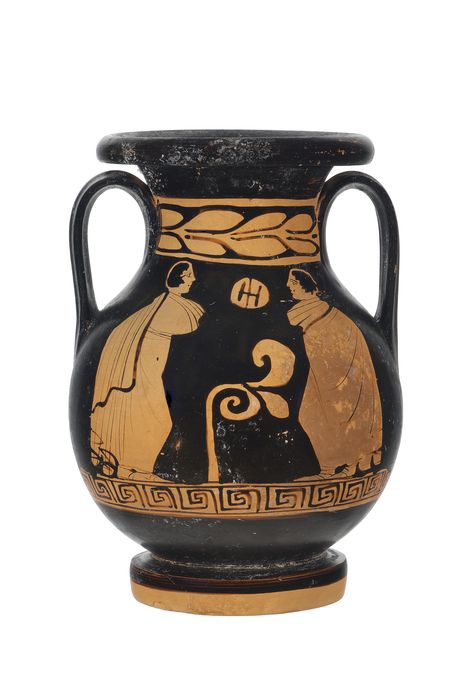 Pelike apula a figure rosse. Lato A: atleta nudo in corsa con strigile; donna vestita di chitone in corsa con palla a spicchi. Lato B: due giovani ammantati, halteres.
