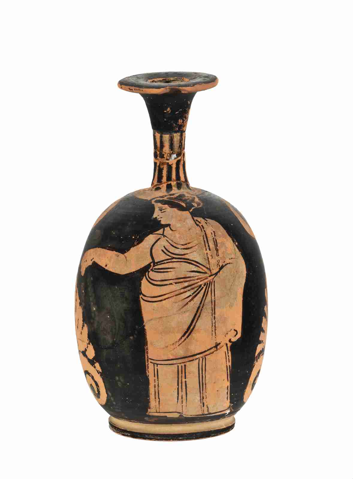 La lekythos presenta un corpo ovoide (simile ad una 'lekythos deianira', tranne che per la forma della bocca), con alto e sottile collo distinto dal profilo concavo e ampio orlo estroflesso, con labbro arrotondato semplice. L'ansa è a nastro e si imposta verticalmente tra la spalla e la metà del collo del vaso; il piede è ad anello, con modanatura a cavetto. La vernice nera è piuttosto opaca e uniforme e copre completamente il vaso, ad eccezione della modanatura del piede, della base e dell'interno del collo e dell'interno dell'ansa. In bianco sono stati resi gli attributi della figura femminile dipinta sul lato A. Il colore dell'argilla è Munsell 5YR 7/8 (reddish yellow). Sul lato A troviamo una figura femminile stante, con il volto di profilo a sinistra e il corpo frontale. I capelli ricciuti sono acconciati con una fascia e le forme del corpo sono quasi del tutto coperte dal chitone e dall'himation, decorato da una fascia che corre lungo l'orlo e drappeggiato tra la spalla sinistra e la vita e retto dal braccio sinistro, coperto. Gli abiti presentano lunghe pieghe regolari piuttosto schematiche (schema ripetitivo a tre linee parallele nella parte bassa del chitone). Il braccio destro è proteso verso sinistra e regge un serto con nastro, mentre una colomba si posa sulla mano, ad ali chiuse: serto e colomba sono sovradipinti in bianco e quasi del tutto sbiaditi. Come motivi decorativi accessori, il lato B presenta una grande palmetta subito sotto l'ansa, mentre ai lati della scena figurata sul lato A troviamo composizioni simmetriche composte da due girali con al centro una mezza palmetta. Sul collo un motivo a baccellatura.