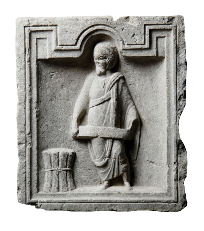 Stele anepigrafe con cornice formata da due listelli aggettanti composti in un contorno a linee spezzate (superiormente interrotte da un semicerchio) di tipo norico-pannonico. La nicchia presenta un fondo ribassato in cui è stato ottenuto il personaggio maschile stante a figura intera che indossa una toga dall’ampio sinus. Egli tiene aperto con ambo le mani un rotolo di pergamena, mentre ai suoi piedi è un fascio di volumi ancora arrotolati. Produzione locale, aquileiese, della fine III inizio IV secolo d.C.