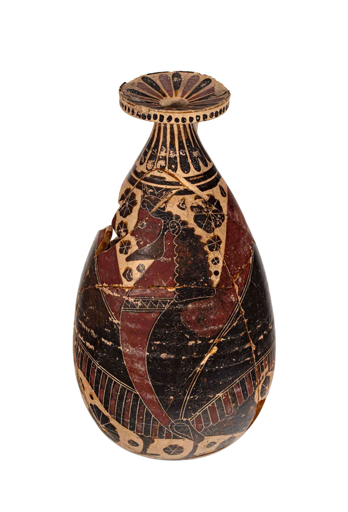 Alabastron corinzio a corpo piriforme con immagine di sfinge a corpo d'uccello ad ali spiegate e volto maschile con barba, in rosso e nero, tra rosette.