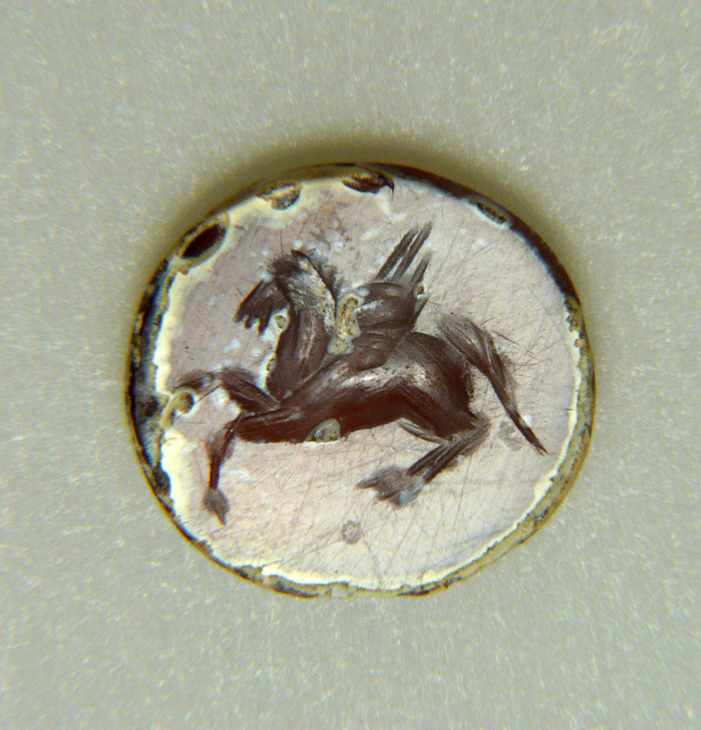 Gemma di forma tondeggiante, piana. Cavallo alato (Pegaso) in volo a sinistra.