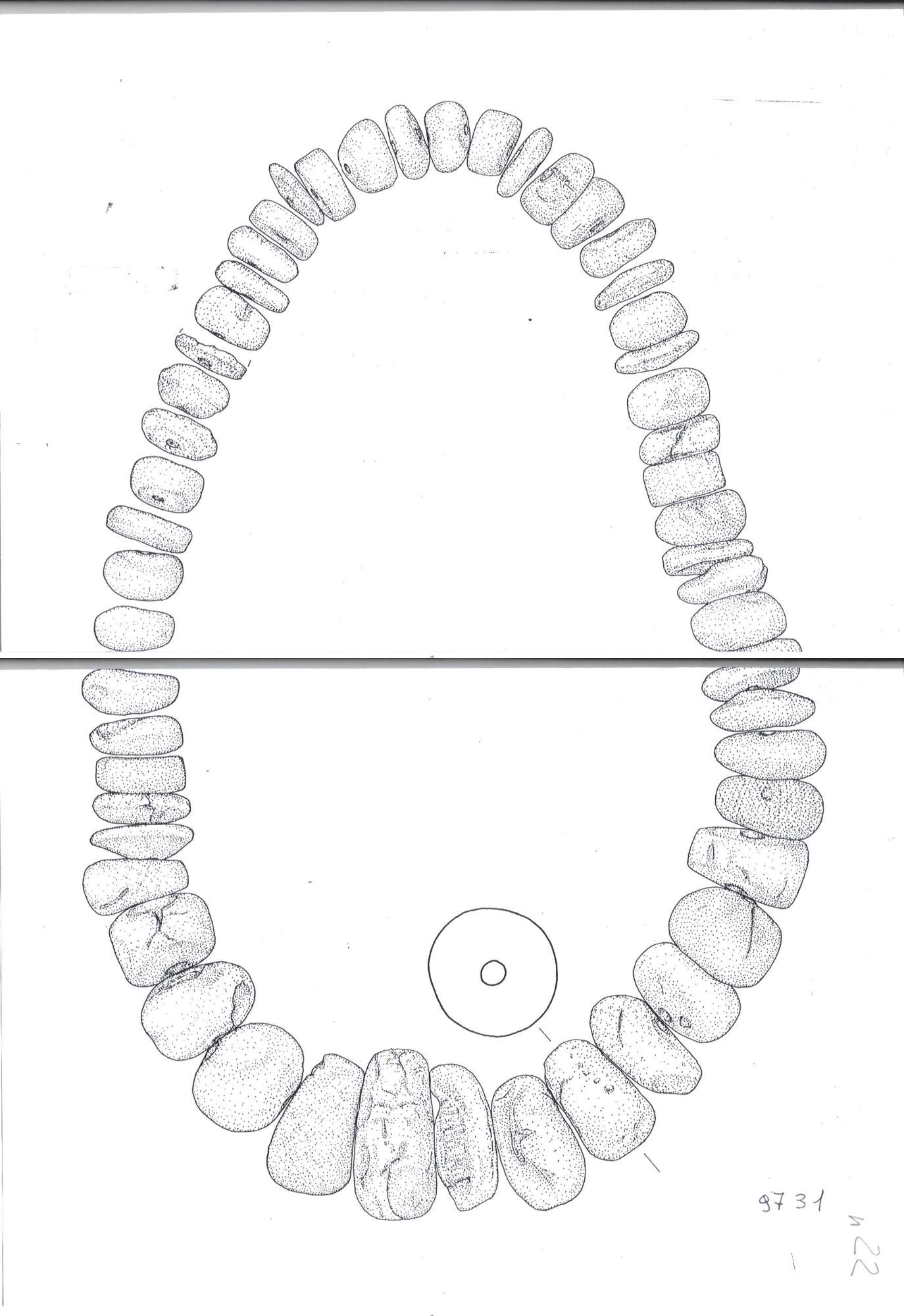 Collana costituita da 52 vaghi d'ambra di dimensioni e forme molto diverse e irregolari (sferica; troncoconica; cilindrica, con estremità a profilo appiattito o arrotondato; discoidale, più o meno ispessita, talvolta con estremità a profilo concavo). Al centro della collana è presente un vago notevolmente più grande degli altri (dim. cm 5,5 x 2,5). L'ambra ha colore rosso bruno, semitrasparente, o bruno scuro, opaco. I fori passanti sono perfettamente circolari e di dimensioni diverse.