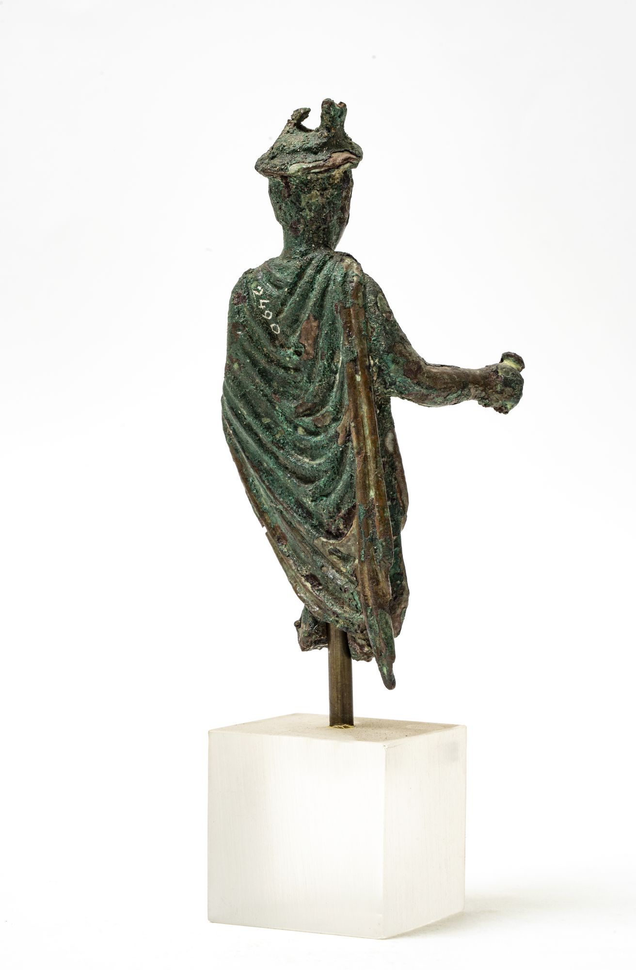 Statuetta di Mercurio. Originariamente reggeva gli attributi che di solito lo caratterizzano. Il capo è coperto dal pètaso, sul quale è visibile una tacca nel punto in cui si impostavano le alette. Il corpo è quasi interamente avvolto da un lungo mantello. Restano tracce dei calzari alati. Il viso, dai tratti poco riconoscibili, è lievemente reclino verso destra. I capelli corti si dispongono a frangetta sulla fronte.