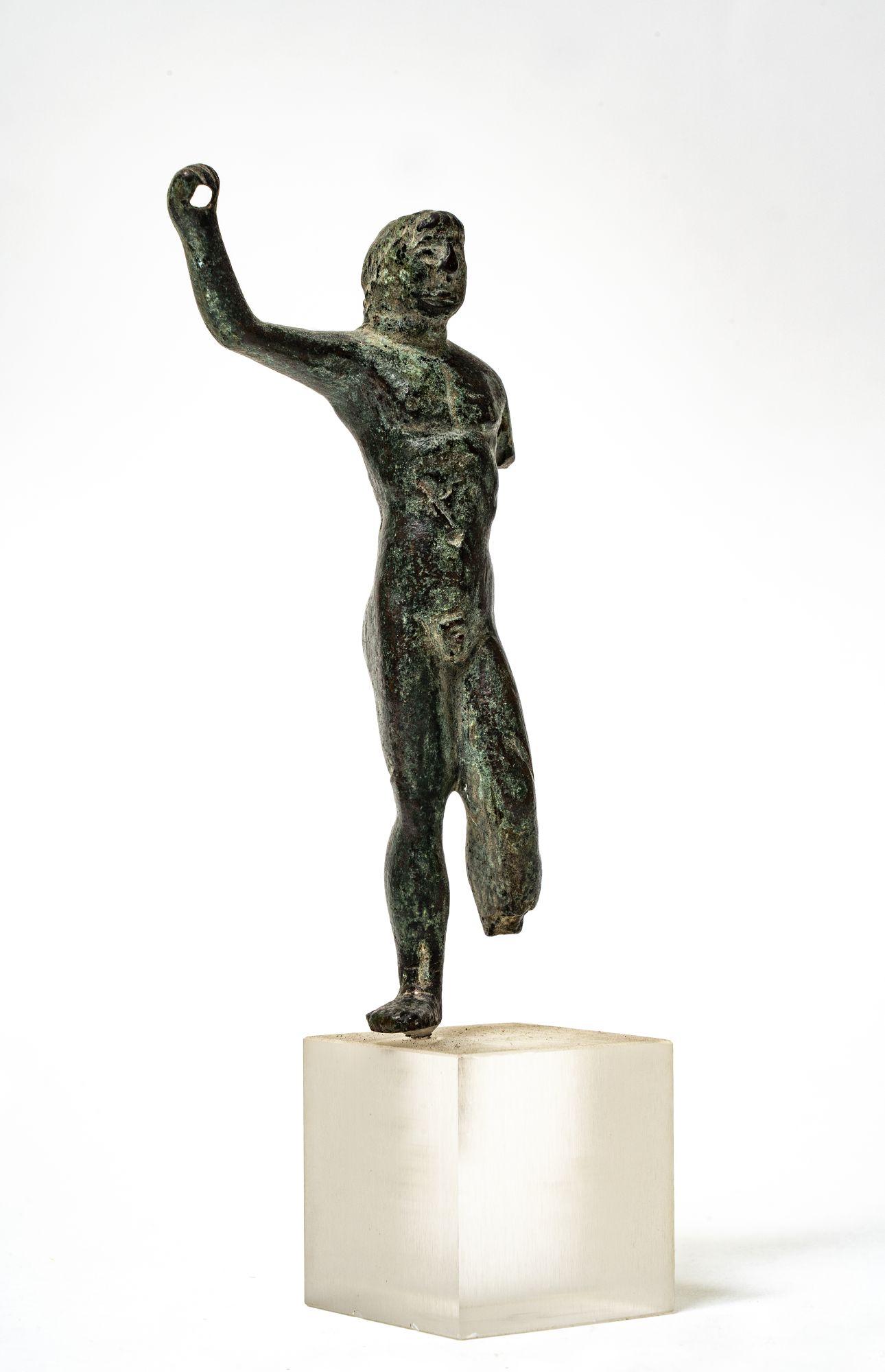 Statuina d'Ercole con braccio destro alzato e foro per la clava, mancante, nella mano. La gamba sin. è piegata indietro. Il volto è schiacciato. Qualche modellazione costale. Patina nera.