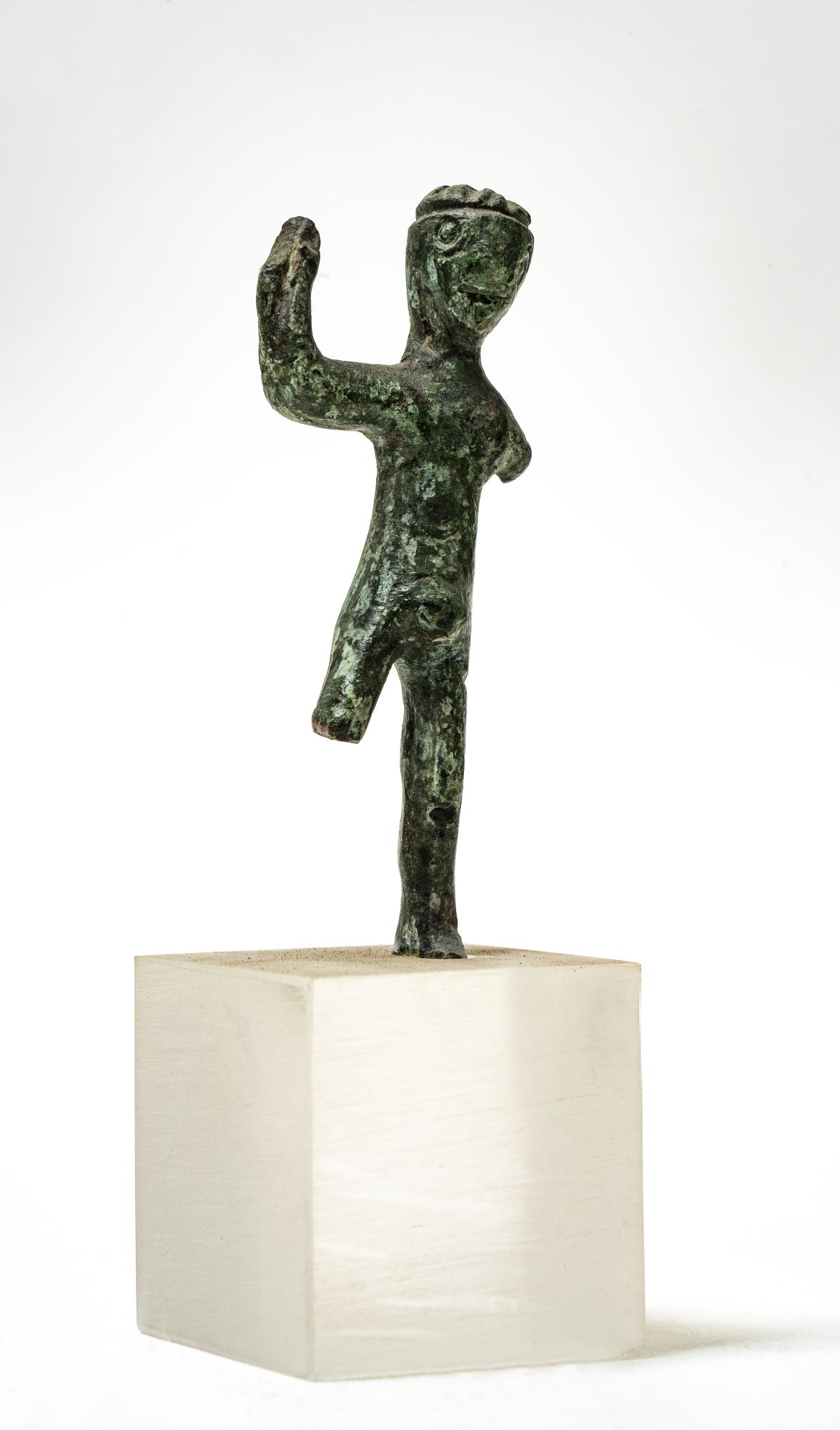 Figurina di uomo ignudo, col braccio destro alzato. Il sinistro, originariamente, era scostato dal corpo e abbassato e forse reggeva uno scudo. La testa è voluminosa e ha una capigliatura resa da brevi solchi a reggiera.