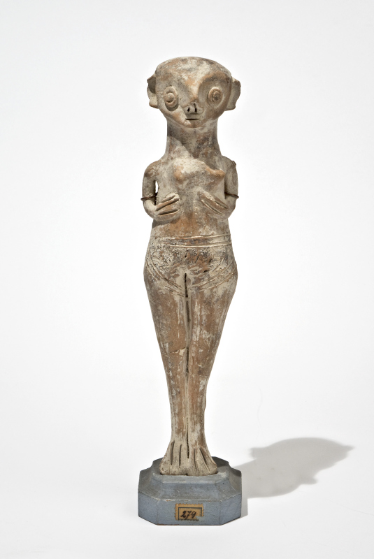 Idolo femminile rappresentante una donna in piedi con le mani sul petto, tipo della Venus Astarte. Lavorazione a mano libera modellata a tutto tondo; testa priva di parrucca, ampie orecchie, occhi circolari in rilievo, grande naso a becco, bocca segnata da un tratto; corpo stante con braccia sotto i seni; vita e cosce segnate da incisione a indicare un indumento: gambe affiancate terminanti in piedi a zampa con dita segnate da incisioni verticali. Residui di rivestitura bianca e tracce di colore.