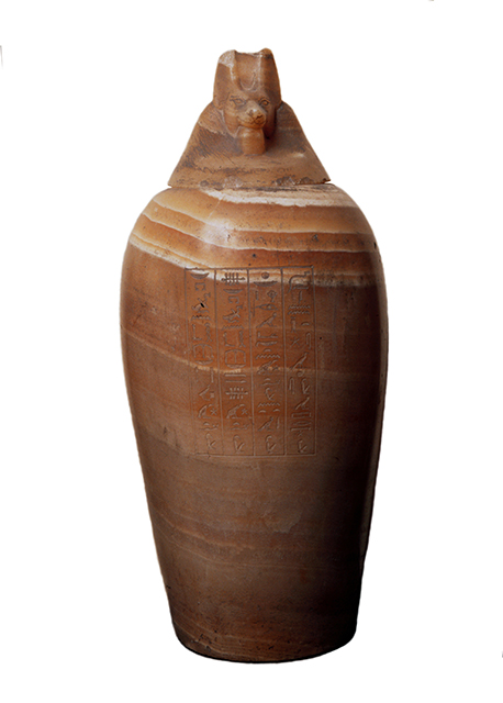 Vaso in alabastro la cui funzione era quella di contenere i visceri mummificati del defunto cui apparteneva. Il corpo del vaso è panciuto e dalla spalla alta, il coperchio è configurato a testa di sciacallo e rappresenta il genio funerario Duamutef. Sul corpo è inciso un riquadro che contiene quattro colonne di iscrizione geroglifica.