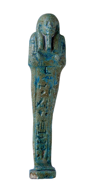 Statuina funeraria mummiforme che indossa una parrucca tripartita, che dietro continua direttamente con il pilastro dorsale, e la barba divina intrecciata. Le mani incrociate tengono ognuna una zappa. Dietro la spalla sinistra pende una sacca. Sotto i piedi è presente una piccola base, che forma un tutt’uno con il pilastro dorsale. L’iscrizione, sul davanti delle gambe, comprende solo il nome del defunto e della madre, scritti in un’unica colonna.
