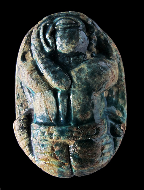 Scaraboide di aspetto alquanto insolito, sul cui ventre si vede una figura umana a testa di sciacallo in piedi davanti al cartiglio in disposizione verticale del prenome del faraone Thutmosi III, Men-kheper-ra. La figura tiene in mano una piuma; della decorazione fanno parte due segni neb, un serpente ed un segno ankh. Il dorso antropomorfo ritrae un uomo accucciato, con la testa girata di lato: si potrebbe interpretare come un prigioniero sottomesso. Foro passante longitudinale.