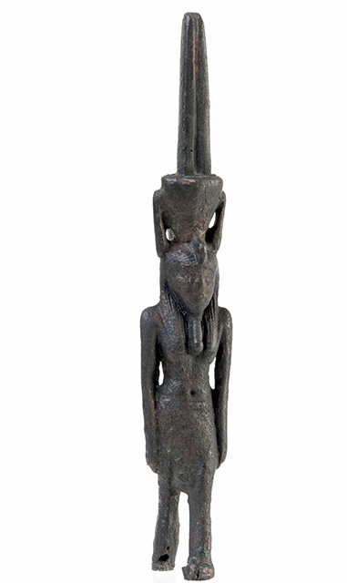 Figurina filiforme del dio Nefertum in bronzo, divinità legata al profumo ed al fiore del loto azzurro. Manca della parte inferiore delle gambe. Il dio è raffigurato nell’atto di camminare con le braccia lungo i fianchi. Indossa un corto gonnellino pieghettato (lo shendit), la parrucca tripartita con un ureo sulla fronte e la lunga barba divina. Sul capo ha il suo tipico diadema: un fiore di loto da cui spuntano due alte piume diritte. Dietro il collo si vede ciò che resta dell'anello di sospensione.