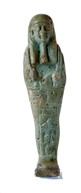 Statuina funeraria mummiforme che indossa una parrucca tripartita, che continua dietro direttamente con il pilastro dorsale, e la barba divina. Le mani incrociate, la destra sopra la sinistra, portano rispettivamente una zappa e un piccone. Dalla spalla sinistra pende una sacca. I piedi poggiano su una piccola base. L’iscrizione, che corre lungo le gambe della statuina, è a T.