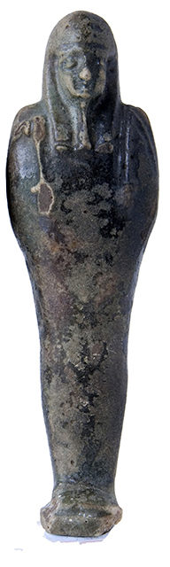 Statuina funeraria mummiforme annerita, forse per effetto del fuoco. Indossa una parrucca tripartita e la barba divina. Le mani sono incrociate ed affiancate, appena accennate: la destra tiene una zappa e la sinistra un piccone. Dalla spalla sinistra pende una sacca. Il pilastro dorsale è presente ed i piedi poggiano su una piccola base. L'ushabti è privo di iscrizione.