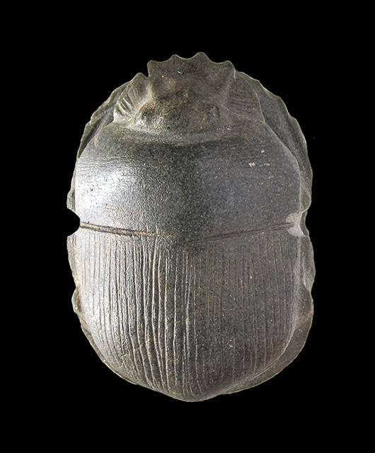 Scarabeo anepigrafe in serpentino, con il ventre liscio e privo di decorazione. Dorso con clipeo molto elaborato; divisione tra protorace ed elitre, le quali sono unite e presentano una zigrinatura verticale. In basso è visibile la forma dello scutello. Senza foro.