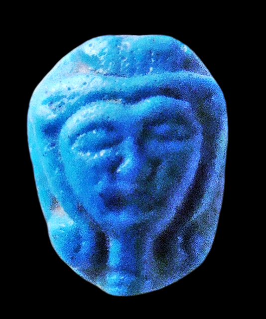 Scaraboide in faience turchese con sul ventre incisione dei segni geroglifici della corona rossa e dell’ankh, capovolti l’uno rispetto all’altro, all’interno di un bordo concentrico. Dorso con il volto della dea Hathor, con le orecchie bovine e la parrucca terminante in due riccioli. Foro passante longitudinale.