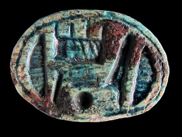 Scarabeo in steatite invetriata turchese con sul ventre incisione del nome di Amon-Ra tra due segni neb, disposto orizzontalmente. Dorso con clipeo, incisione a T che separa protorace ed elitre, le quali presentano piccole tacche a V. Foro passante longitudinale.