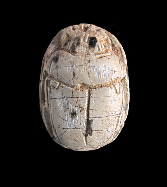Scarabeo in steatite grigia; sul ventre incisione con segni geroglifici che costituiscono una formula non interpretabile con sicurezza. Dorso con clipeo e incisione a T che separa protorace ed elitre, le quali presentano tacche a V; sui lati si vedono le zampe ripiegate. Foro passante longitudinale.