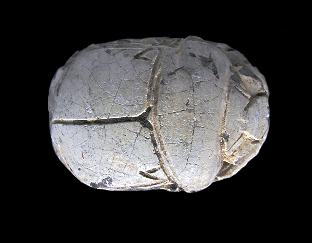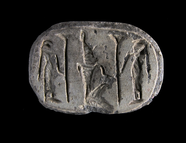 Scarabeo in steatite grigia con sul ventre una rappresentazione del faraone con la corona bianca dell’Alto Egitto genuflesso tra due divinità femminili che reggono lo scettro uag. Dorso con clipeo stilizzato, doppia divisione orizzontale tra protorace ed elitre, piccola incisione a V sopra la divisione delle elitre e tacche a V laterali. Foro passante longitudinale.