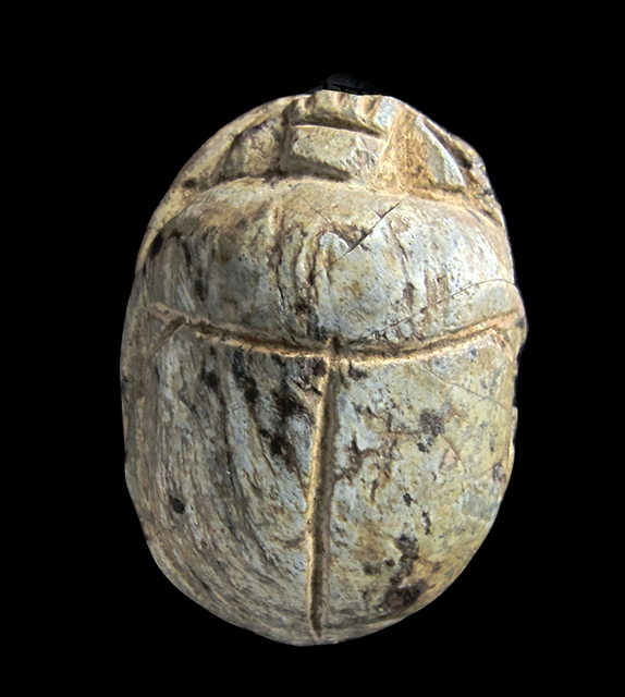 Scarabeo in steatite grigio chiaro con sul ventre incisione di motivo geometrico, con la riga centrale che imita i segni geroglifici del prenome di Thutmosi III, con disposizone simmetrica. Dorso con clipeo stilizzato e incisione a T che divide il protorace dalle elitre. Foro passante longitudinale.