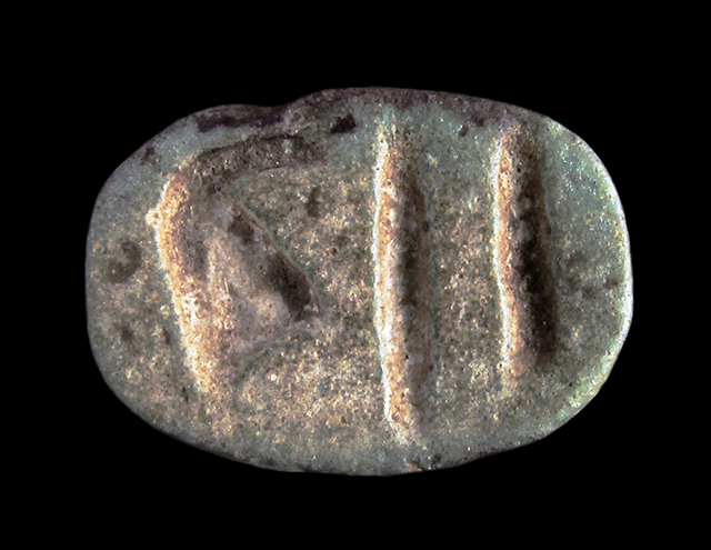 Scaraboide in faience verde; sul ventre incisione di segni non interpretabili (il primo da sinistra potrebbe essere un ureo) e dorso liscio. Foro passante longitudinale.