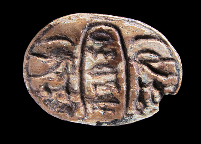 Scarabeo in steatite marrone con sul ventre incisione di un motivo molto simile a quello “a-n-r” in un cartiglio disposto verticalmente, affiancato su ciascun lato da un ugiat e due segni nefer. Dorso con clipeo, elitre e protorace non sono distinti. Foro passante longitudinale.