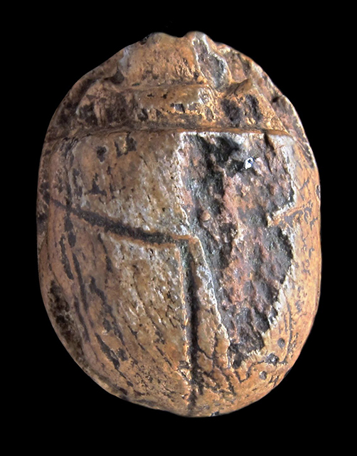 Scarabeo in steatite marrone con sul ventre rappresentazione di faraone seduto con scettro e flagello; davanti a lui una figura umana stante, più in piccolo. Dorso con separazione a T tra protorace ed elitre, testa con clipeo. Foro passante longitudinale