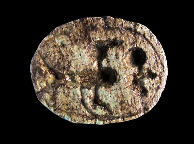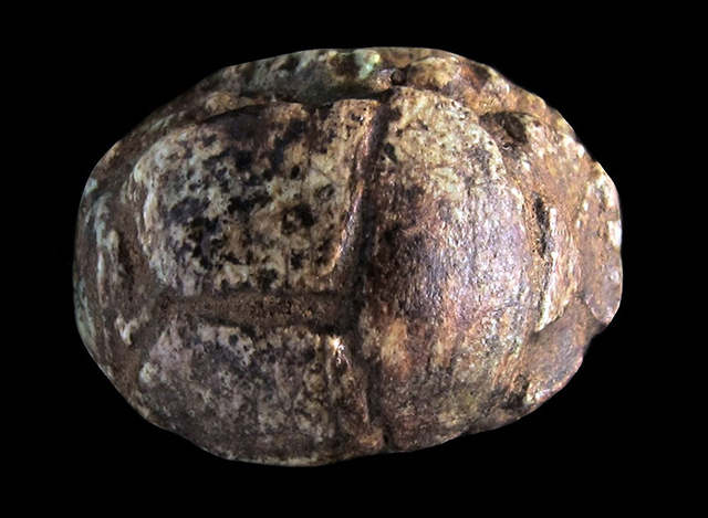 Scarabeo in steatite grigia con sul ventre ncisione crittografica del nome di Amon-Ra. Dorso con clipeo elaborato, protorace ed elitre arrotondate separati da incisione a T; in basso visibile lo scutello. Foro passante longitudinale.