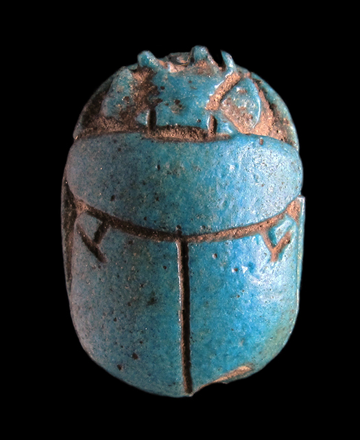 Scarabeo in faience turchese, con sul entre raffigurazione di un ugiat, sotto il quale vi è a destra un segno nefer e a sinistra il segno dell’uomo seduto con la mano alla bocca; si tratta forse dell’augurio “Salute e bene!”. Dorso con clipeo ed incisione a T per dividere il protorace e le elitre che presentano tacche a V. Foro passante longitudinale.