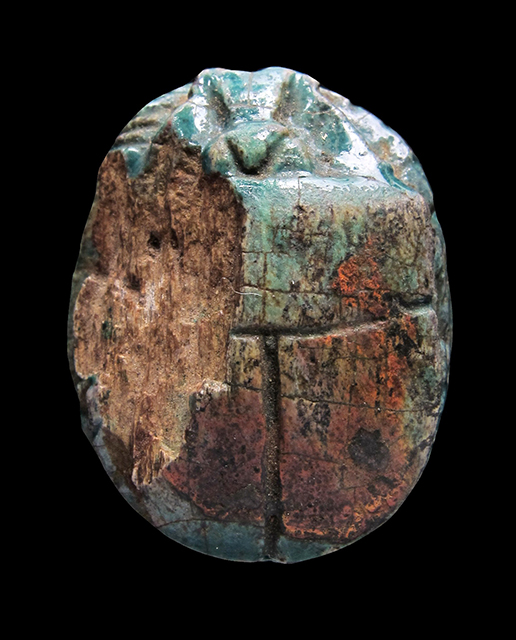Scarabeo in steatite invetriata turchese con sul ventre incisione del nome di Amon-Ra tra due segni neb. Il dorso è scheggiato nella parte sinistra, ma rimangono visibili le incisioni del clipeo e le elitre. Foro passante longitudinale.
