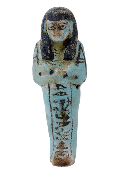 Statuina funeraria mummiforme che indossa una parrucca tripartita ed un collare dipinti in nero. Le braccia sono incrociate, la destra sopra la sinistra, e le mani tengono ognuna una zappa, anch’essa in nero. L’iscrizione corre lungo una colonna frontale.