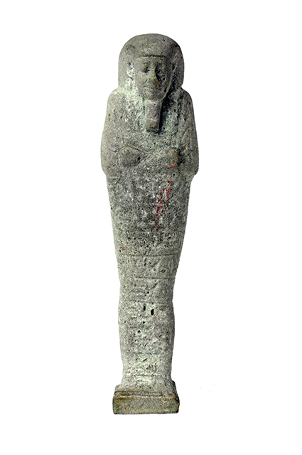 Statuina funeraria mummiforme che indossa la parrucca tripartita e la barba divina. Le braccia sono incrociate sul petto, le mani sono affiancate: nella sinistra c'è una zappa e nella destra un piccone. Dietro la spalla sinistra pende una sacca. Sul dorso c'è il pilastro dorsale che forma un tutt'uno con la piccola base quadrangolare. Attorno alle gambe ci sono 8 righe parallele di testo geroglifico, che sicuramente riportano il capitolo 6 del Libro dei Morti, pur risultando ormai del tutto illeggibili.