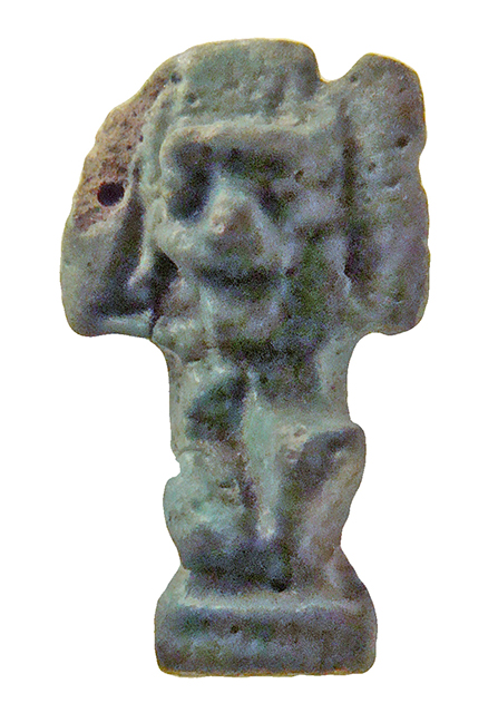 Amuleto in faience raffigurante il dio dell'aria Shu. Il dio è raffigurato inginocchiato, con indosso un gonnellino e con le braccia alzate simmetricamente a reggere un disco solare sopra il capo. I piedi poggiano su una piccola base parallelepipeda. All'altezza della testa è stato ricavato un foro passante.