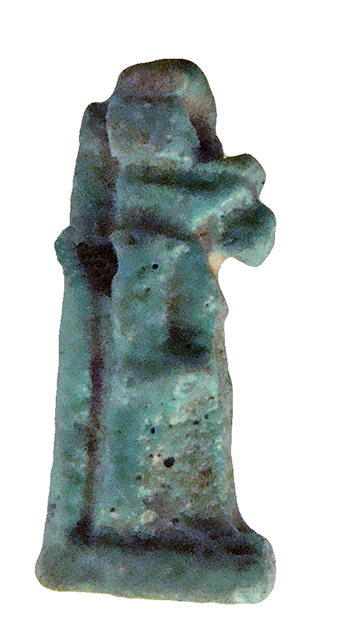 Amuleto in faience raffigurante la divinità apotropaica Toeris, patrona delle partorienti e dei neonati. La dea è raffigurata, in modo molto stilizzato, in piedi, con il muso di coccodrillo, una lunga parrucca, il corpo da ippopotamo gravido, con le braccia distese lungo il corpo. I piedi poggiano su una base parallelepipeda, mentre il dorso con la coda da coccodrillo si fonde con il pilastro dorsale, forato per permettere la sospensione dell'amuleto.