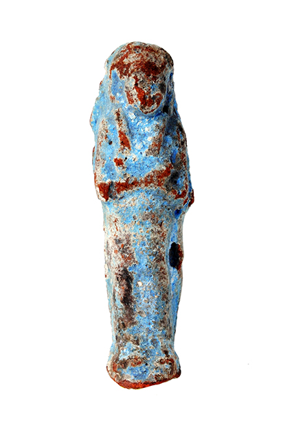 Statuina funeraria in terracotta ingobbiata e dipinta di azzurro, a imitazione della faïence. Le braccia sono incrociate, la destra sopra la sinistra, le mani sembrano reggere due zappe. La statuina ha il retro piatto e i contorni slabbrati, a causa dell'uso di uno stampo singolo per la fabbricazione. L'ushabti è anepigrafe.