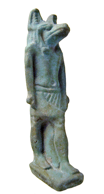 Amuleto in faience raffigurante il dio Anubi. Il dio dalla testa di sciacallo è raffigurato in piedi, nell’atto di camminare (con la gamba destra in avanti) e con le braccia stese lungo i fianchi; le mani sono chiuse a pugno. Le orecchie sono molto evidenti, così come il muso canino allungato. Indossa un corto gonnellino pieghettato. Data la minutezza della figura, i piedi poggiano su una piccola base parallelepipeda, mentre sul retro vi è il pilastro dorsale, che presenta un foro passante.