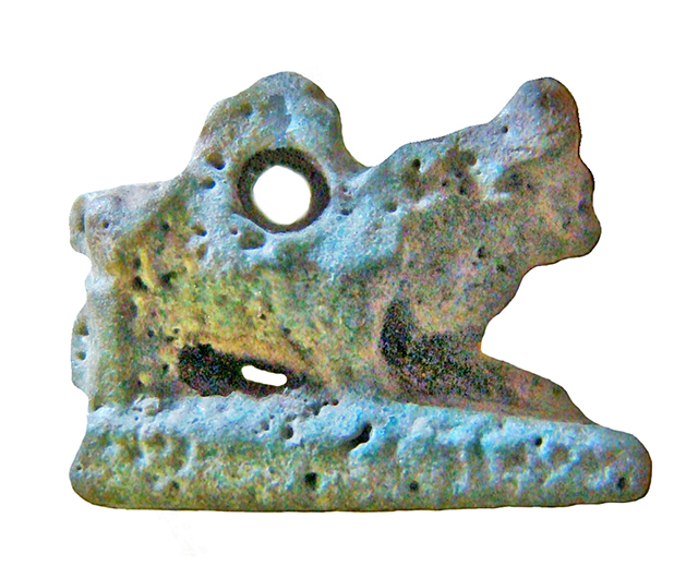 Amuleto in faience lavorato a tutto tondo, con presa forata nella parte superiore. Raffigura un toro disteso su una piccola base. A causa della minutezza dell'oggetto, i dettagli sono scarsamente distinguibili.