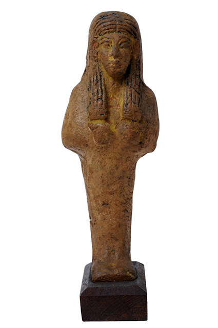 La statuina funeraria mummiforme indossa una parrucca tripartita con striature nere. Le mani sono incrociate una vicina all’altra, alla stessa altezza e senza attrezzi. L’ushabti è privo di iscrizioni.