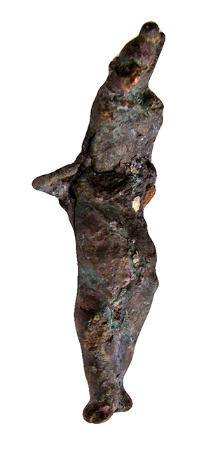 Amuleto in bronzo raffigurante il dio Arpocrate: il dio fanciullo è ritratto nudo, semidisteso. L'anatomia grassoccia lo associa alle raffigurazioni degli eroti di epoca ellenistica. I tratti iconografici che lo contraddistinguono si vedono a malapena, dato il cattivo stato di conservazione della superficie: la treccia infantile che scende sul lato destro del capo e il braccio destro piegato per portare l’indice alla bocca. Sul capo porta la corona doppia dell'Alto e Basso Egitto. Arpocrate è una divinità bambina il cui culto avrà molta fortuna nelle epoche finali della storia egiziana, ed è considerato figlio di Iside ed Osiride.
