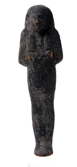 Statuina funeraria mummiforme, con parrucca tripartita. Le mani incrociate sul petto, affiancate, non recano attrezzi e non si vedono tracce di iscrizione.