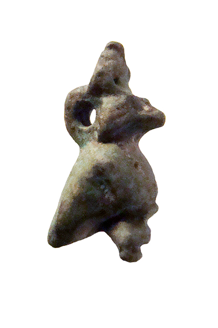 Amuleto in faience lavorato a tutto tondo, raffigurante il dio Horus in forma di falco, con in capo la corona atef e le zampe che probabilmente poggiavano su una piccola base, ora perduta. Dietro la testa è presente un anello di sospensione.