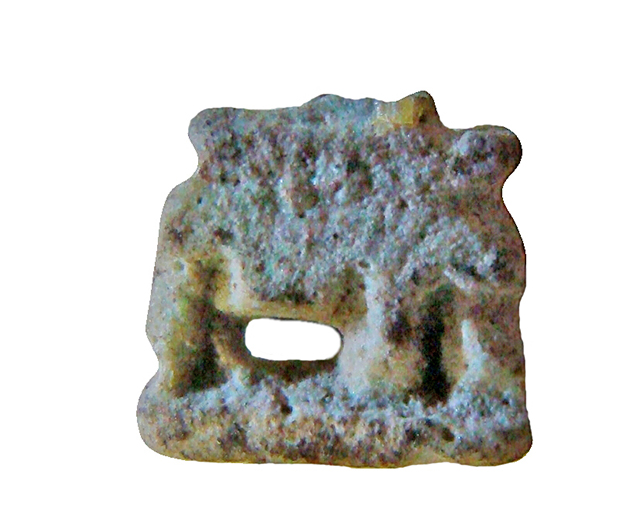 Amuleto in faience lavorato a tutto tondo, raffigurante una scrofa stante su una piccola base, con le mammelle in evidenza e con presa sulla schiena; nonostante la minutezza dell'oggetto, la resa è abbastanza precisa.