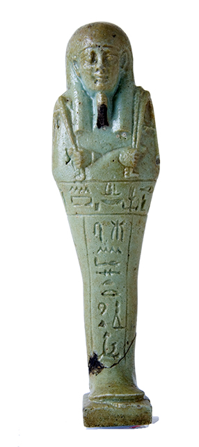 Usciabti in faience del sacerdote lettore del tempio e profeta Her-ef-er-neith, della XXVII-XXX dinastia, inv. 31445; Statuetta funeraria mummiforme, dall'Egitto