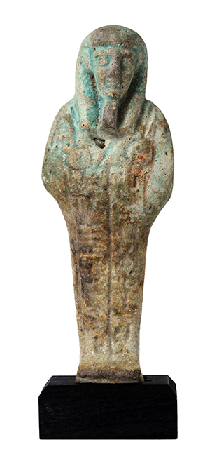 Statuina funeraria mummiforme, con le mani incrociate sul petto, che reggono una zappa ciascuna. L'ushabti porta una parrucca tripartita e la barba divina. Sono presenti la base sotto i piedi e il pilastro dorsale. Lungo il corpo, nella parte anteriore, sono presenti due colonne di iscrizione geroglifica, purtroppo illeggibili.