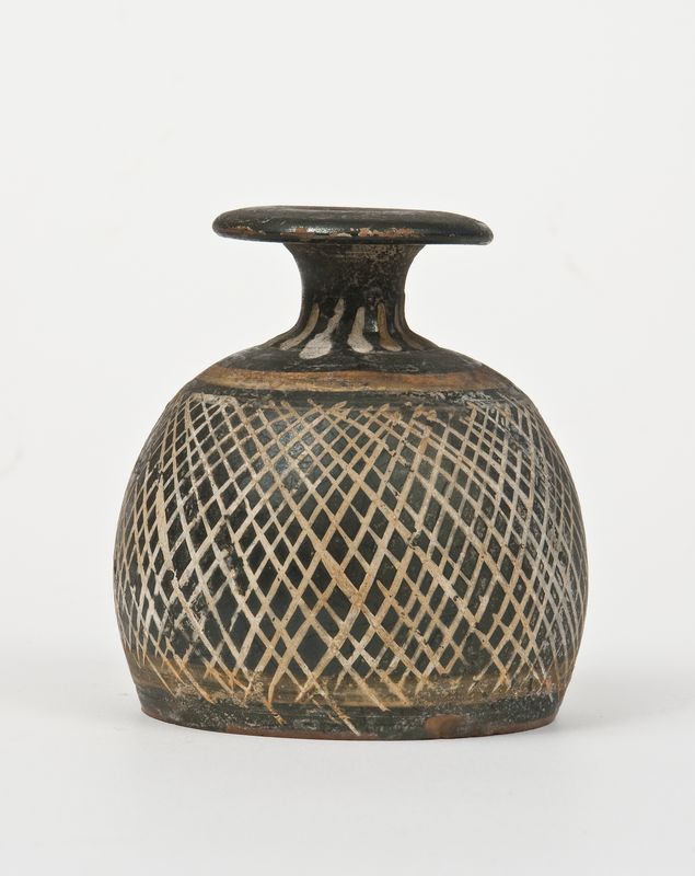Alabastron “a calamaio” a vernice nera con sovraddipinture in bianco crema e giallo ocra. Labbro a tesa discoidale dal profilo leggermente convesso, orlo estroflesso, collo slanciato a profilo cilindrico, spalla distinta convessa, corpo troncoconico, fondo quasi completamente piatto. Sul collo sequenza di bastoncelli verticali, sulla spalla fascia in giallo ocra, sul corpo motivo a reticolo con maglie romboidali sovraddipinto in bianco, inquadrato superiormente e inferiormente da fasce, quella superiore, più sottile, in bianco, quella inferiore, più spessa, in giallo (copre anche parzialmente il reticolo).