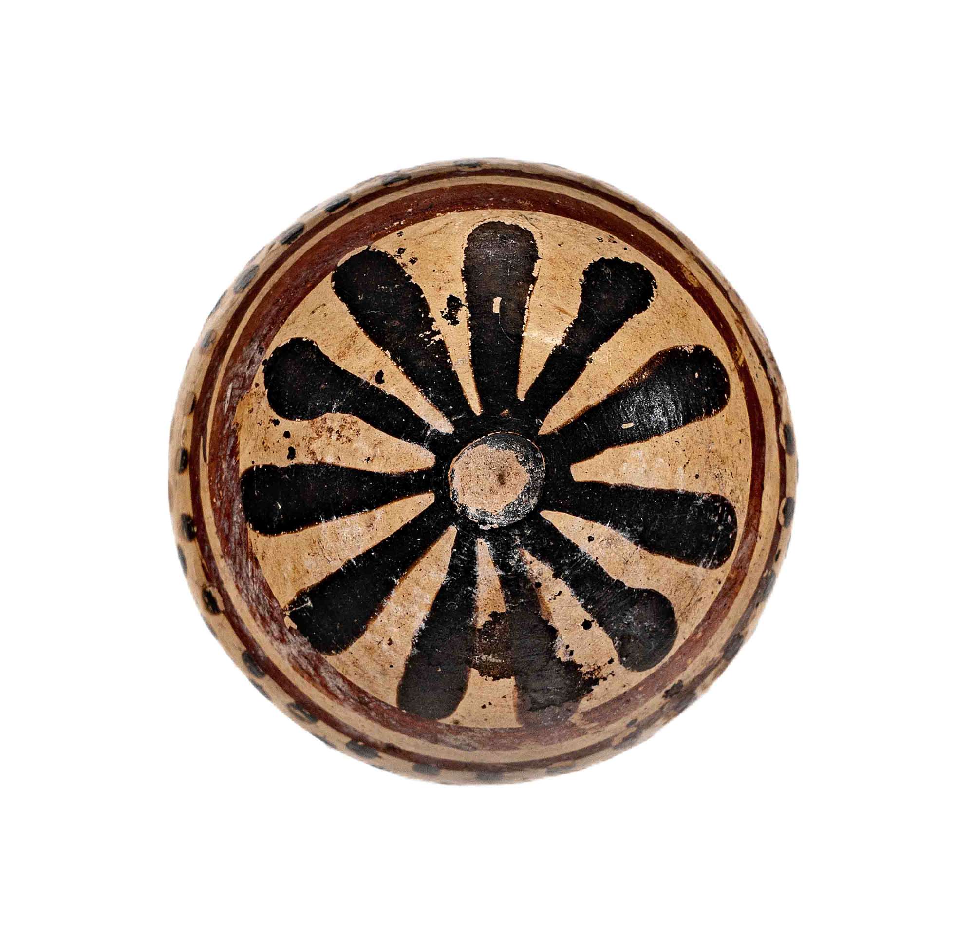 Alabastron corinzio a fasce con gocce allineate brune tra fasce rosse. Fondo, collo e labbro resi a raggiera di petali.