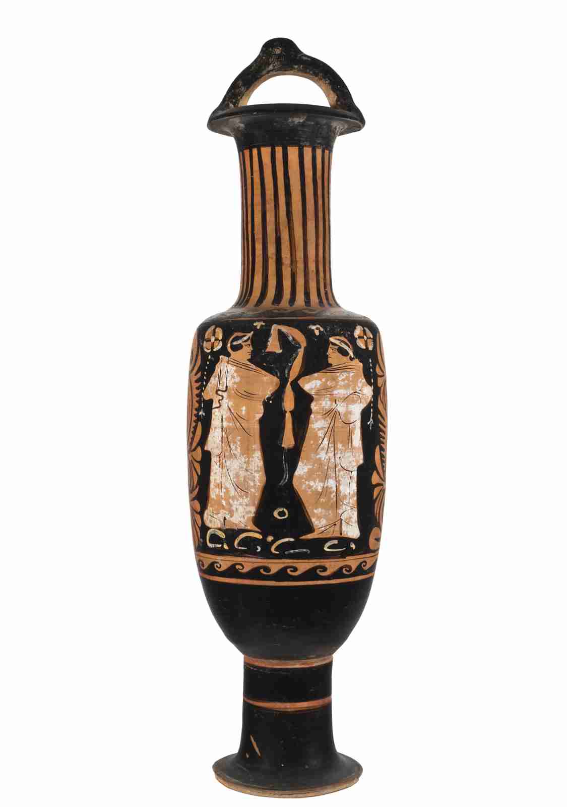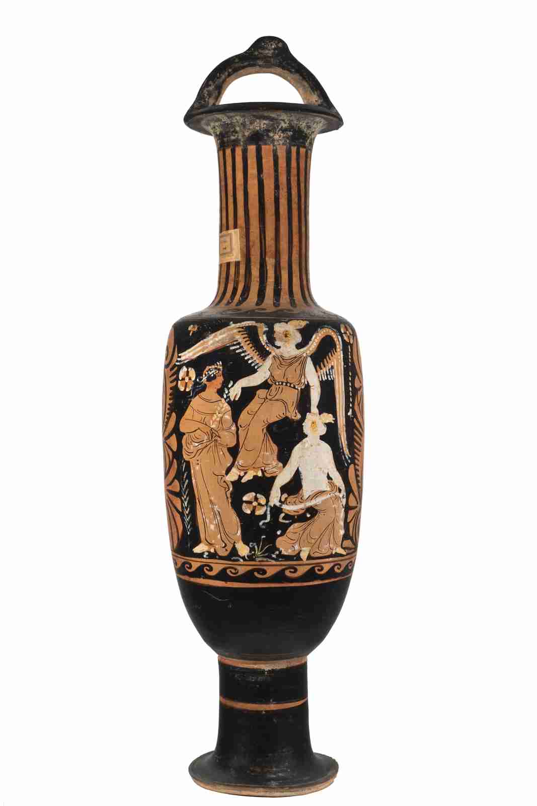 Il vaso presenta un corpo ovoide con pareti cilindriche e spalla pronunciata e segnata da un listello a rilievo; il collo è lungo e dal profilo cilindrico, con imboccatura svasata e orlo estroflesso semplice. Il corpo del vaso poggia su un piede a disco semplice con un alto stelo. L'ansa sopraelevata presenta un foro per la sospensione. La vernice nera è opaca, uniforme e risparmia l'interno della bocca e dell'ansa, nonché due filetti, all'attaccatura del piede e a metà dello stesso; sono inoltre presenti estese sovradipinture in bianco e giallo-bruno, non solo per dettagli, ma anche per campiture più ampie. Il colore dell'argilla oscilla tra Munsell 7.5YR 7/6 (reddish yellow) e 2.5 YR 6/8 (light red). La composizione del lato A presenta tre figure femminili disposte su due piani; la figura in alto è alata, seduta su un elemento del paesaggio indicato solo da lievi tratti sovradipinti in bianco, molto sbiaditi. La fanciulla ha il volto di profilo a sinistra, il torso di tre quarti e le gambe accavallate all'altezza delle tibie; le grandi ali sono spiegate e ricche di dettagli decorativi: una fila di punti bianchi sull'orlo superiore, una prima fila di penne in nero e una se-conda in bianco, resa con una serie di tratti paralleli di lunghezza differente. Porta i capelli, dipinti in bianco e dettagliati in giallo-bruno, così come la pelle, raccolti in uno chignon sulla nuca, con riccioli che ricadono sulle tempie. Il lungo chitone, naturalisticamente drappeggiato, è cinto sotto al costato da una cintura decorata da punti bianchi; bianco-gialli sono anche i piedi, probabilmente a rappresentare delle calzature. La figura in basso a sinistra è in posizione stante, con il volto di profilo a destra; il torso è frontale, la gamba destra portante, la sinistra leggermente flessa. I capelli, neri, sono corti e cinti da un serto, sovradipinto in bianco, con una catenella che sventola dietro la nuca. La figura veste ciò che sembra essere un lungo chitone, con un himation drappeggiato attorno al braccio sinistro. In questo caso la pelle non è bianca, indicando forse una figura maschile; i piedi invece sono dipinti in bianco, probabilmente a segnalare delle calzature. Nella mano destra regge una fronda a forma di spiga, sovradipinta in bianco. A destra troviamo un'altra figura femminile seduta su un elemento del paesaggio appena accennato, analogamente alla figura alata in alto. Il volto è di profilo a sinistra, mentre il torso, di tre quarti, è rivolto verso destra; le gambe, corte rispetto al resto del corpo, sono flesse. I capelli sono anch'essi molto simili a quelli della figura alata, sovradipinti in bianco, dettagliati in giallo-bruno e raccolti in uno chignon. La pelle è completamente campita in bianco e i dettagli anatomici sono quasi del tutto scomparsi. La fanciulla è seminuda, soltanto la metà inferiore del corpo è drappeggiata da un mantello; ai piedi porta dei calzari. Tra le mani regge una tenia, sovradipinta in bianco. La scena è completata da una serie di elementi paesaggistici come la fronda all'estrema sinistra e il ciuffo d'erba tra le due figure in basso, entrambi sovradipinti in bianco. Vi sono inoltre alcuni riempitivi, tre fiori con dettagli in bianco (a sinistra della testa della figura stante, tra le due figure in basso e a destra della testa della fanciulla alata, in questo caso con catenella). Il lato B presenta una scena di dialogo tra due giovani ammantati: le due figure sono quasi speculari, perfetta-mente di profilo, con i capelli corti e cinti da una tenia. Dai mantelli, dalla sovradipintura bianca molto sbiadita, spuntano solo le teste e si può intuire la posizione delle gambe, una portante e l'altra flessa. L'himation della figura a sinistra presenta un orlo bordato di nero. Una serie di rapidi tratti arcuati e di punti in bianco-giallo fa da piano di appoggio alle due figure. Come riempitivo compaiono, sempre specularmente, in alto due fiori con catenella, analoghi a quelli del lato A, altri due fiori molto stilizzati e, al centro, una tenia, con un orlo bianco molto sbiadito; sempre al centro, in basso, un cerchio. I motivi accessori includono, sul collo, una serie di linguette verticali nere ad imitazione di una baccellatura e, sul-la spalla, un fregio a onde marine destrorse tra due filetti risparmiati. Sotto alla decorazione principale, un analo-go motivo a onde marine tra due filetti risparmiati. I lati del vaso presentano un intricato motivo a girali (quattro, in una fila verticale al centro), foglie e palmette ai lati. Si è conservata sul collo l'etichetta recante la data di acquisizione da parte del museo: «16 febbraio 1904». L'attuale numero di inventario generale è scritto sotto al piede.